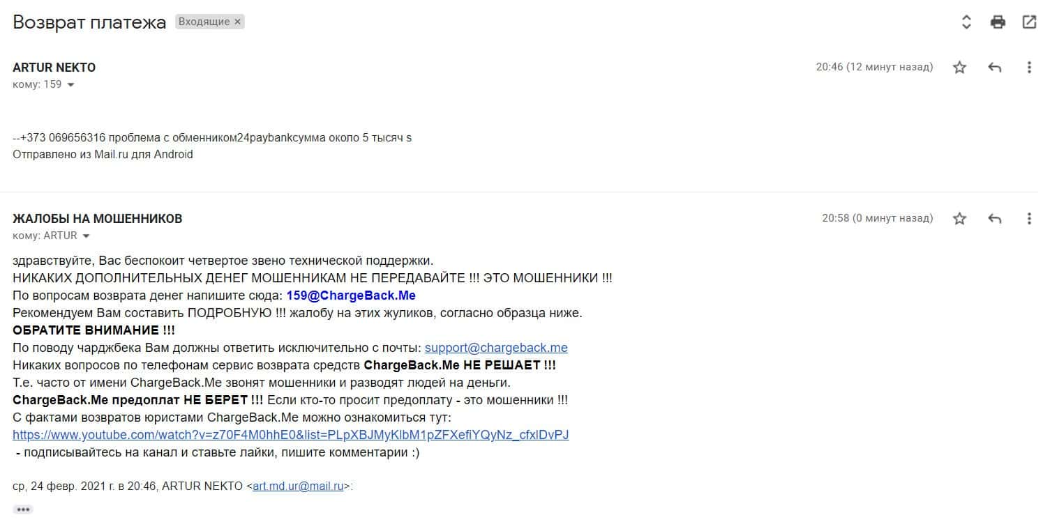 Авантюристы 24 Пей Банк заблокировали пользователя, сославшись на то, чтобы он обратился на абсолютно посторонний почтовый адрес, где он естественно получил отказ.