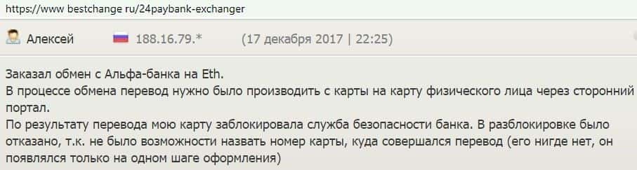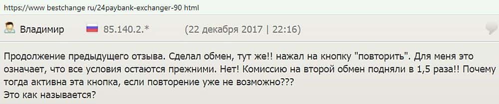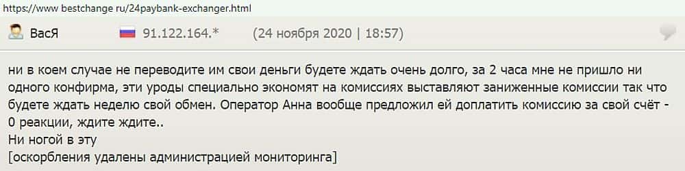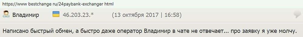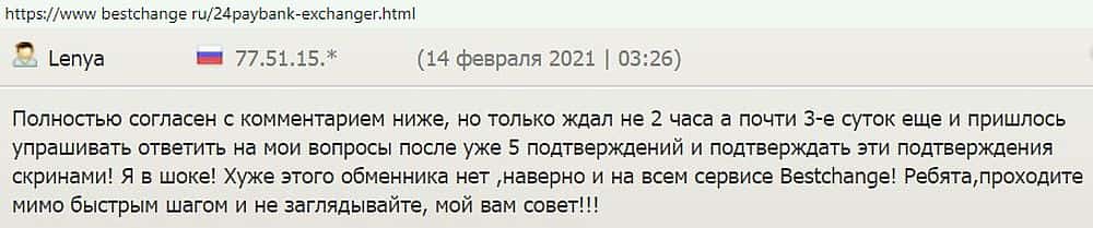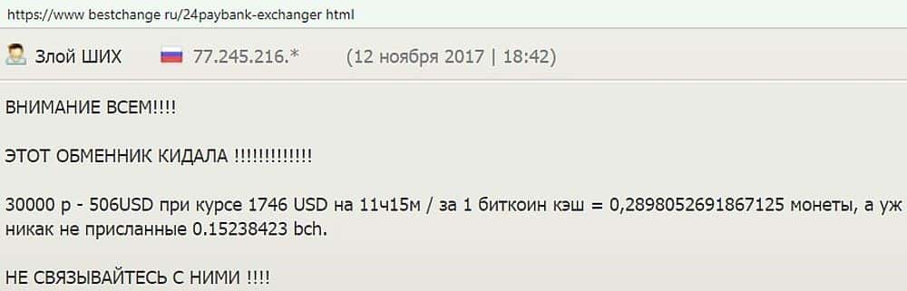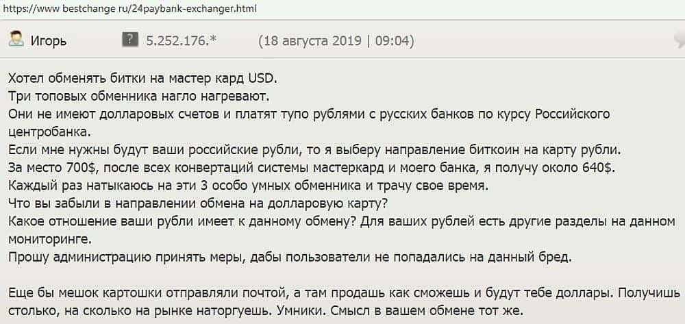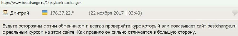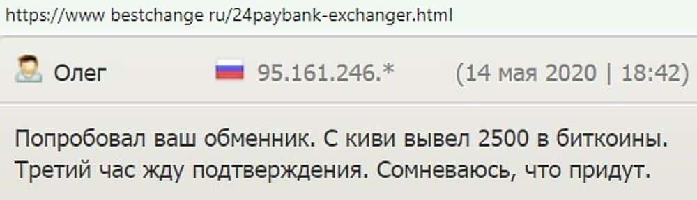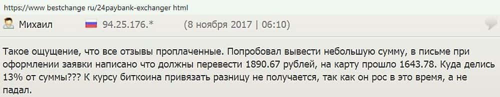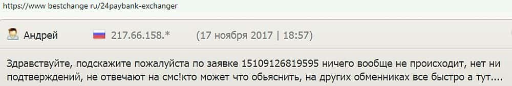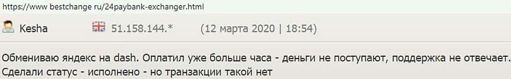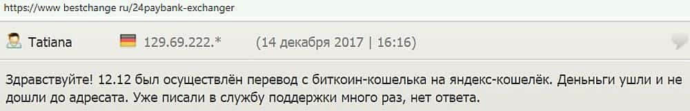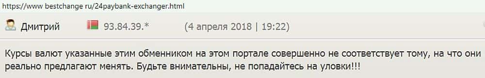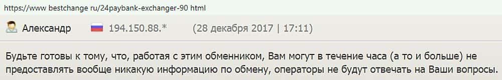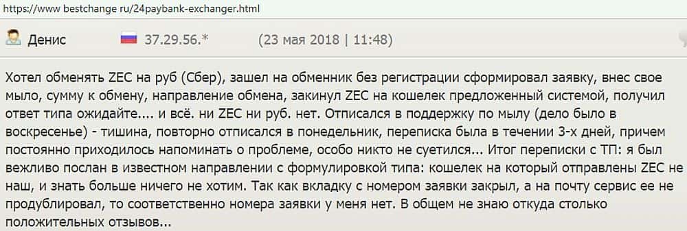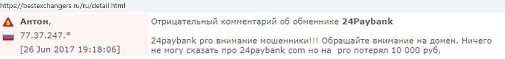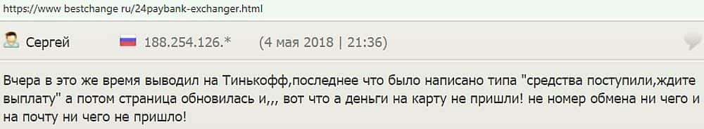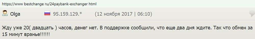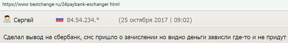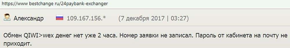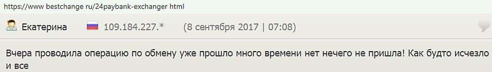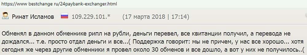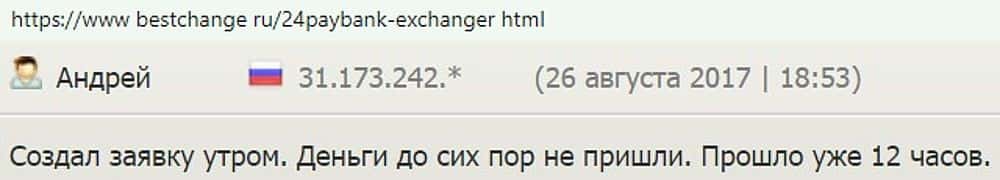 Обмен с помощью шарашки 24 Пей Банк- гиблое дело. Деньги свои вы так и не увидите. Вот очередной отзыв о ненадежности псевдосервиса 24PayBank Net от юзера бестчейндж ру.