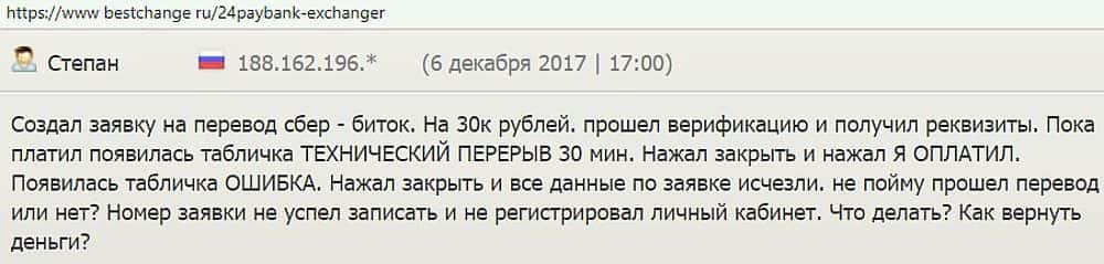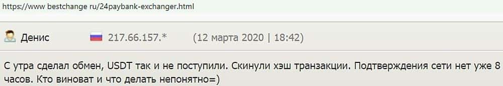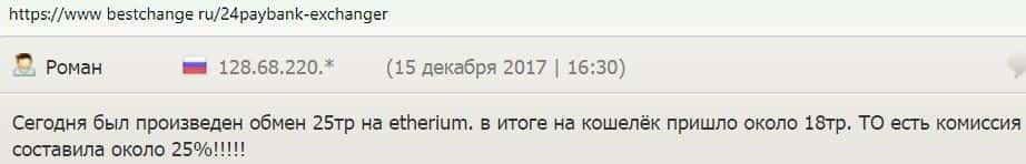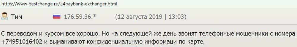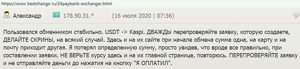 Некоторым людям приходит только половина суммы. Так, при обмене человек потерял 14000. Чаще всего кидалы 24 Пей Банк проворачивают воровство при обмене криптовалюты.