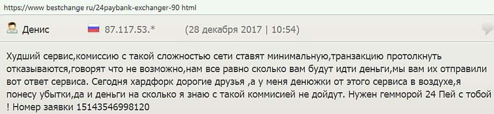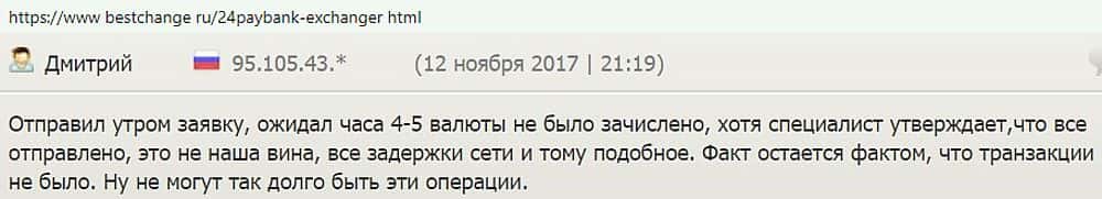 И еще один подобный случай, когда заниженная комиссия сыграла не на руку клиенту помойного сервиса 24PayBank Net. Он так и не дождался выводимых с площадки средств.