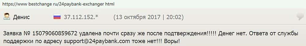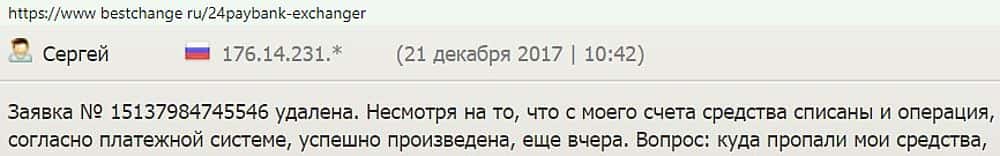 В очередном отзыве на веб-ресурсе бестчейндж ру человек рассказывает, что кидалы 24 Пей Банк удалили заявку якобы потому, что деньги не пришли, хотя со счета они были сняты.