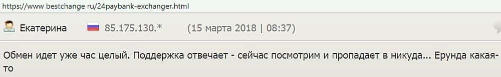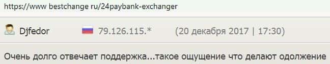Мало кто может сказать хорошее слово о работе техподдержки катал 24 Пей Банк. И это не удивительно, ведь задержки при транзакциях тут обычное явление, а поддержка просто молчит.