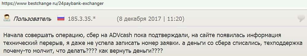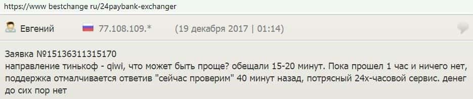 С первого же обмена у пользователей сервиса 24 Пей Банк возникают проблемы. Аферюги категорически не желают выводить средства своей клиентуры, просто подмучивая их себе.
