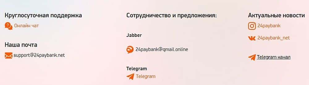 Для своего обувалова, аферюги 24 Пей Банк используют ограниченное количество контактов - это два электронных ящика и несколько ссылок на социальные сети групп аферы: