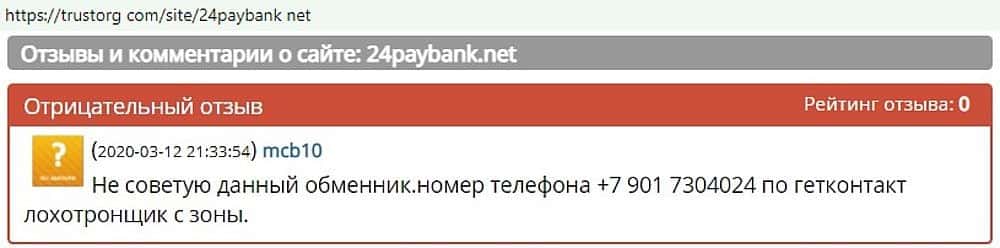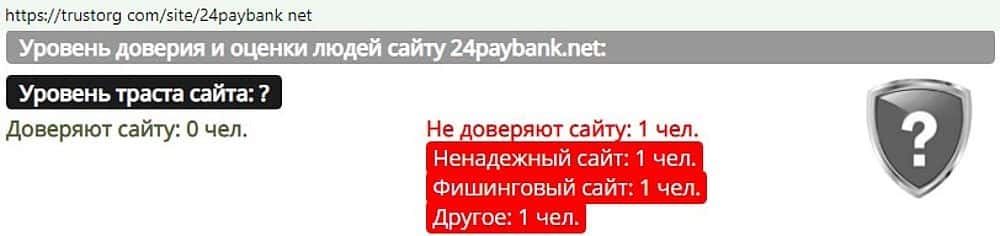 По мнению того же сайта трасторг ком, шарлатанству 24 Пей Банк доверять не следует. Потому, как этому ресурсу не доверяют многие интернет-пользователи, обвиняя его в фишинге.