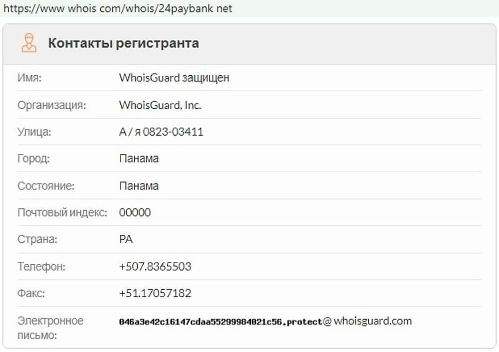 Хозяин доменного имени 24paybank net не считает нужным предоставить свои данные своим пользователям, поэтому он предпочел использовать сторонний сервис для их сокрытия.