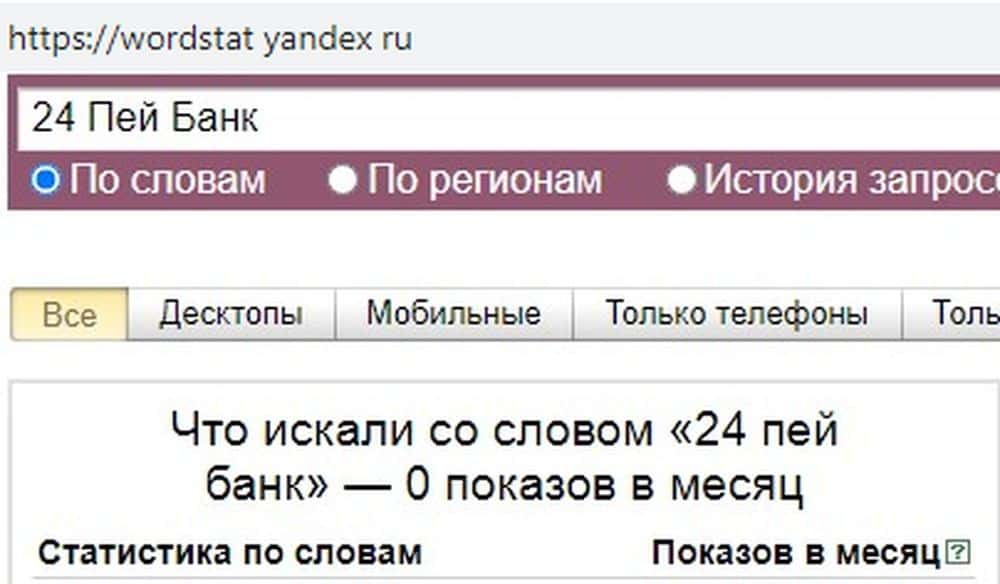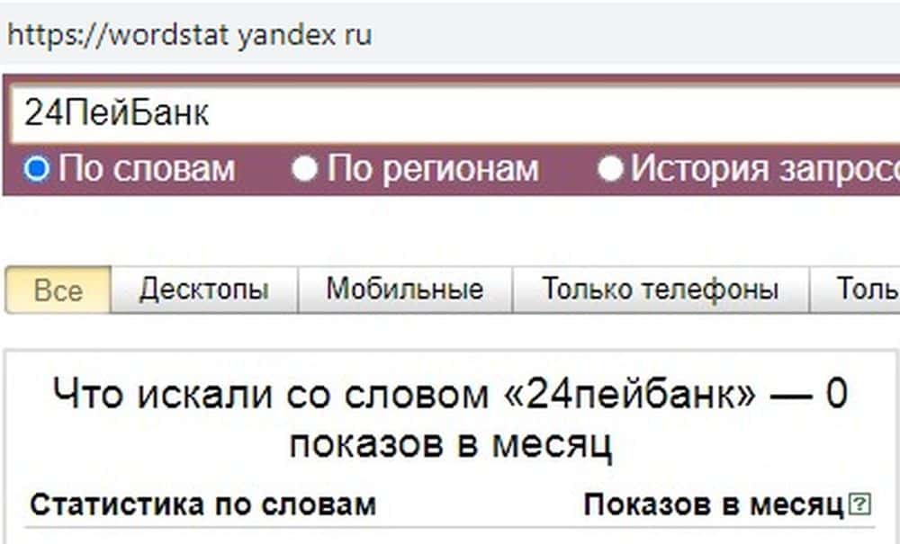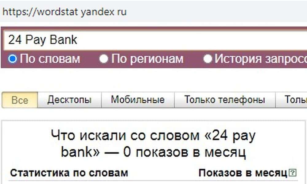 Махинаторы 24PayBank Net популярностью в сети совсем не пользуются - чтоб это понять, достаточно просмотреть, что по запросу "24 Пей Банк" не было ни одного показа за весь месяц.