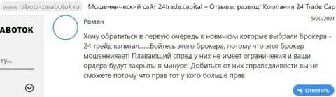 У мошенников 24 Трейд Капитал плавающий спред не имеет ограничения и ордера клиентов они закрывают в минус - предупреждает следующий пользователь.