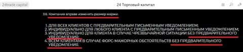 Обратим внимание на некоторые моменты этих документов. Мошенники 24 Трейд Капитал закрепляют за собой право без уведомления клиента изменять кредитное плечо. А уж формажорные обстоятельства они вам запросто нарисуют.