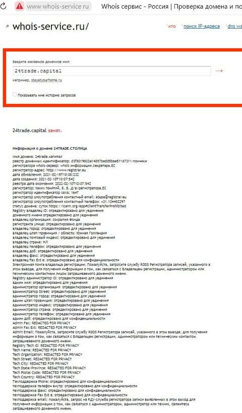 Кому принадлежит домен 24trade capital выяснить не удалось, на сайте whois-service ru вся информация о его владельце бдительно отредактирована и скрыта. Это говорит о том, что перед нами типичный мошеннический лохотрон.