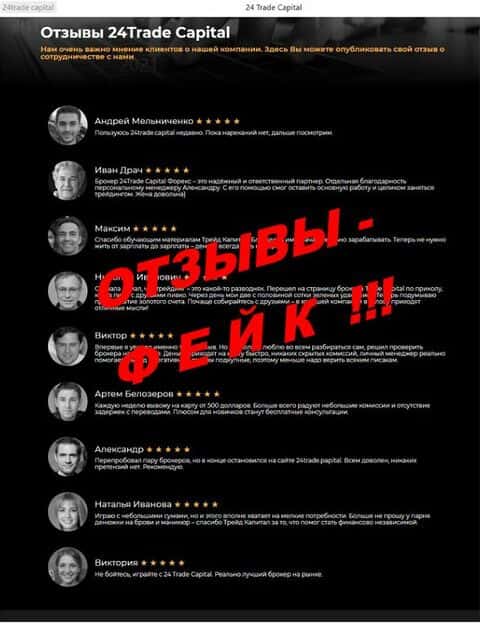 На видном месте мутноброкер 24 Трейд Капитал разместил не информацию о своем регуляторе или лицензию, а отзывы подставных людей. Понятно, что все они далеки от истины.