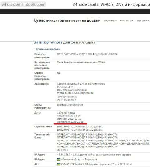 - Аферисты 24 Трейд Капитал всячески пытаются скрывать информацию о возрасте своего домена