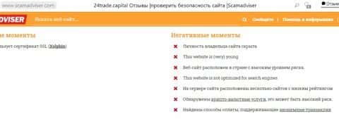 Сайт Scamadviser обращает внимание, что у сайта мутноброкерской шарашки 24 Трейд Капитал множество признаков типичного лохоразводилова.