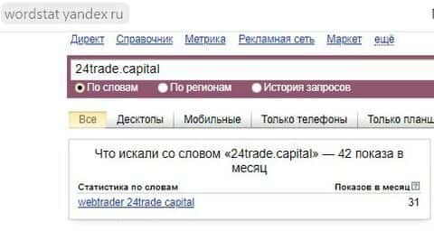В системе Яндекс за прошедший месяц было сделано всего 31 поисковых запросов по бренду "24Trade Capital". А это значит, что заявленный на сайте мировой опыт и известность - полная лажа.
