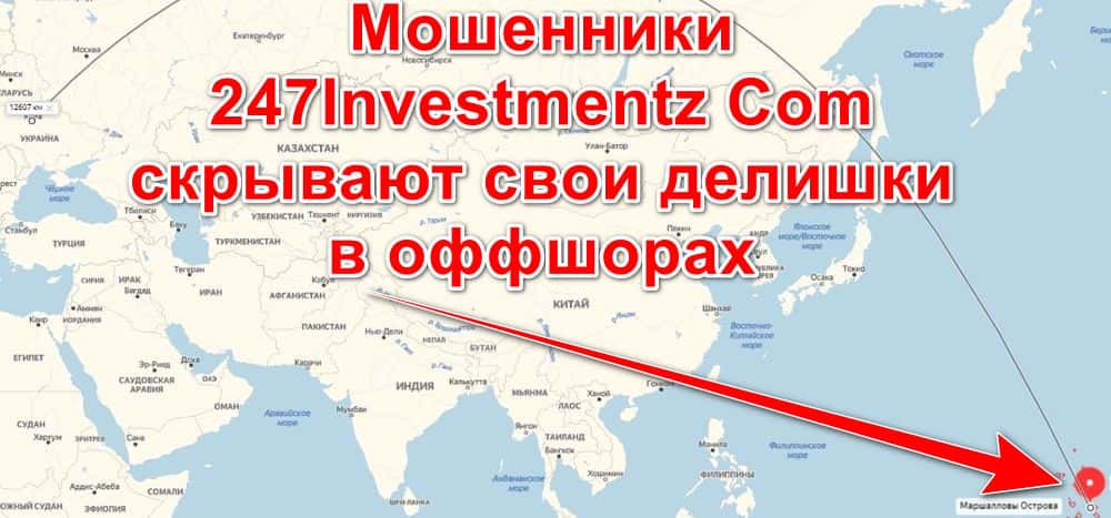 Свою незаконную деятельность фиктивная брокер-контора 247Investmentz Com осуществляет, находясь в оффшорной зоне на Маршалловых островах. Это очень усложняет привлечение к ответственности недодилеров за обман и воровство. Расположились они по адресу: Ajeltake Road Ajeltake Island, Majuro Marshall Islands MH 96960.