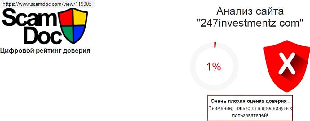 Как оказалось даже домен сайта фальшивых дилеров 247 Инвестментз не имеет никакого доверия. По данным полученным на независимом портале scamdoc com, он опасен даже для перехода на него. Лжеброкеры 247 Инвестментз так торопились побыстрей сорвать куш, что даже не учли таких элементарных вещей.