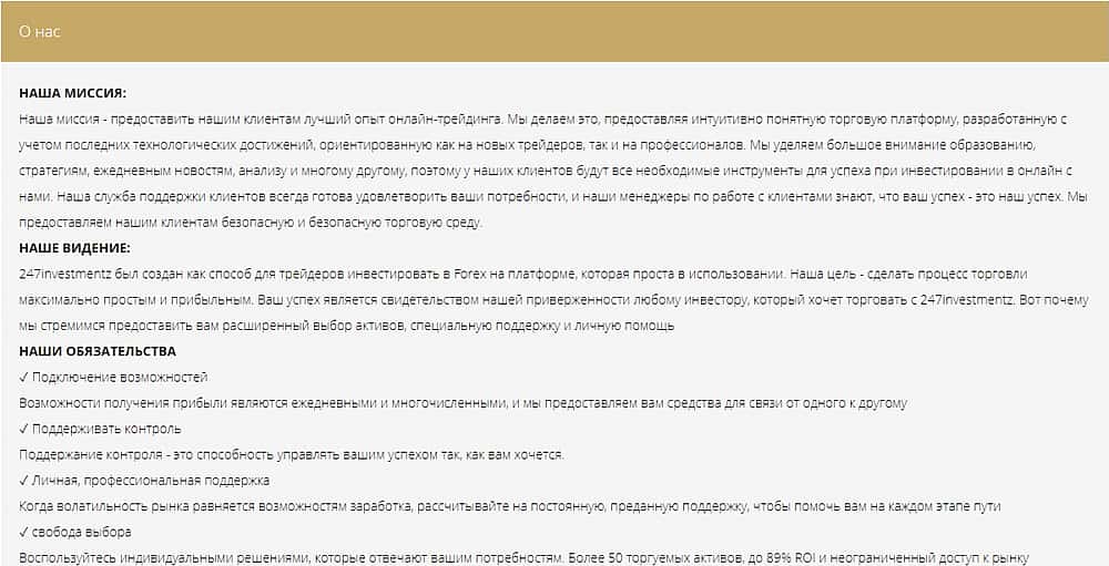 Аферисты 247 Инвестментз постарались, сделав картинку на сайте привлекательной, но это всего лишь ширма сомнительной конторы за которой скрывается афера. Что происходит в этом кухонном дилинговом центре на самом деле, можно узнать, пройдясь по разделам сайта и внимательно ознакомившись с содержимым.
