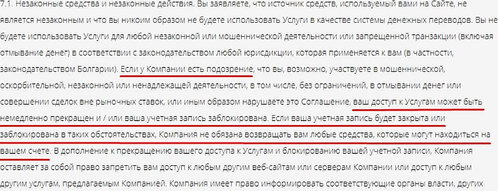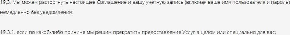 Вот еще один пунктик псевдосоглашения от зарвавшихся авантюристов 247 Инвестментз. Просто напросто разорвать свой фиктивный лжедоговор воры 247 Инвестментз могут в любой момент когда захотят. Когда видимо денег на очередную виллу хватать не будет, тогда и начнется блокировка аккаунтов и воровство средств без объяснений.
