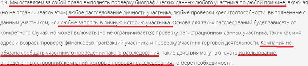 Воровская брокерская контора 247 Инвестментз может списать закрытие или блокировку счета трейдера, а также не выплату денег, просто обвинив его в якобы мошенничестве. То есть никаких доказательств или разбирательств. Кухонные дельцы 247 Инвестментз приготовили для себя лазейки, чтоб проще было заниматься похищением средств.