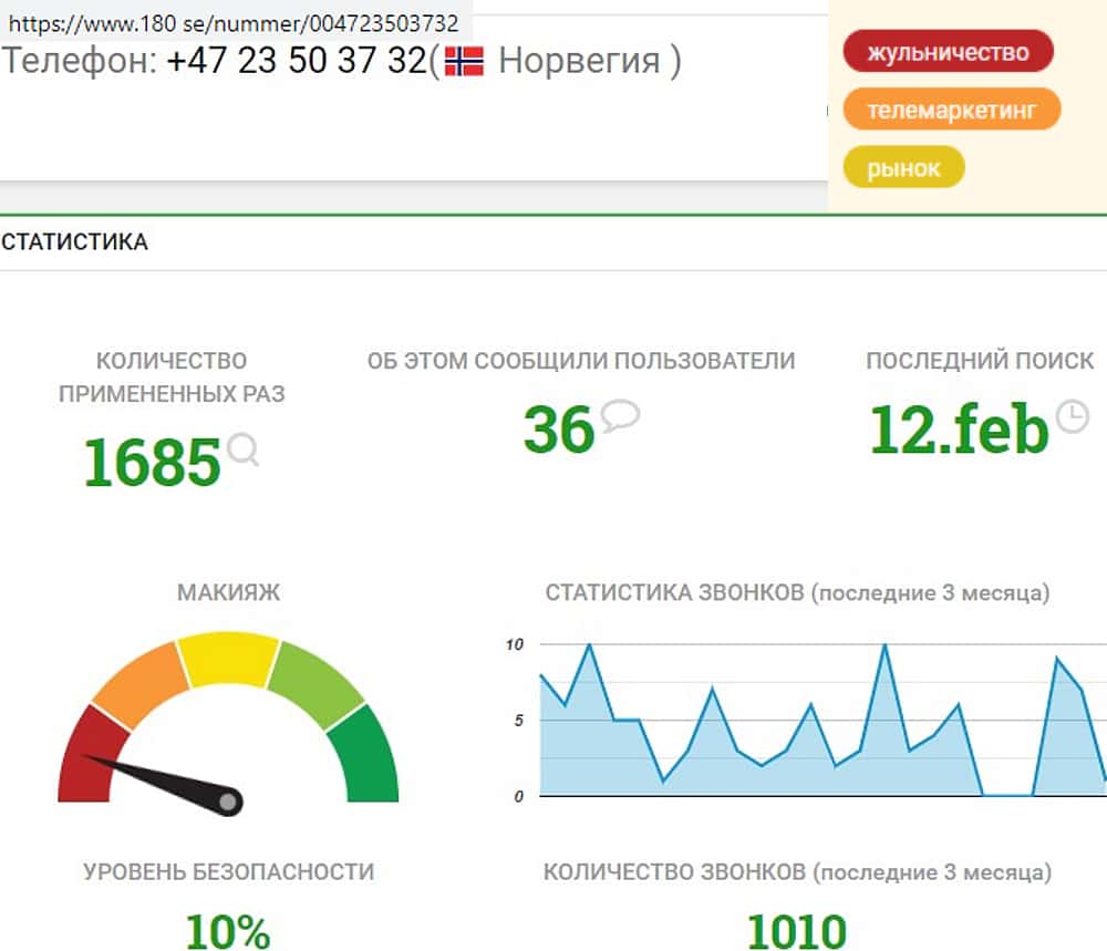 По данным справочника отзывов и принадлежности телефонных номеров 180 se, удалось получить информацию, что норвежский номер телефона находится в черном списке. Пользователи оставившие отзыв о звонках с этого номера, жалуются на явные попытки мошеннических действий со стороны звонящих.