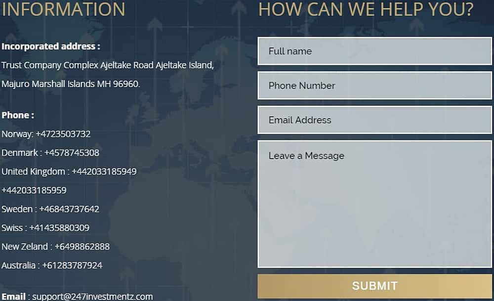Желая показать величие своей недоброкерской компании 247Investmentz Com, в качестве контактных данных мошенники привели электропочту, обратную форму связи и несколько телефонов в разных странах мира. Имитация присутствия псевдофилиалов якобы в других государствах должно внушать доверие. Но так ли это? Контакты кидал: