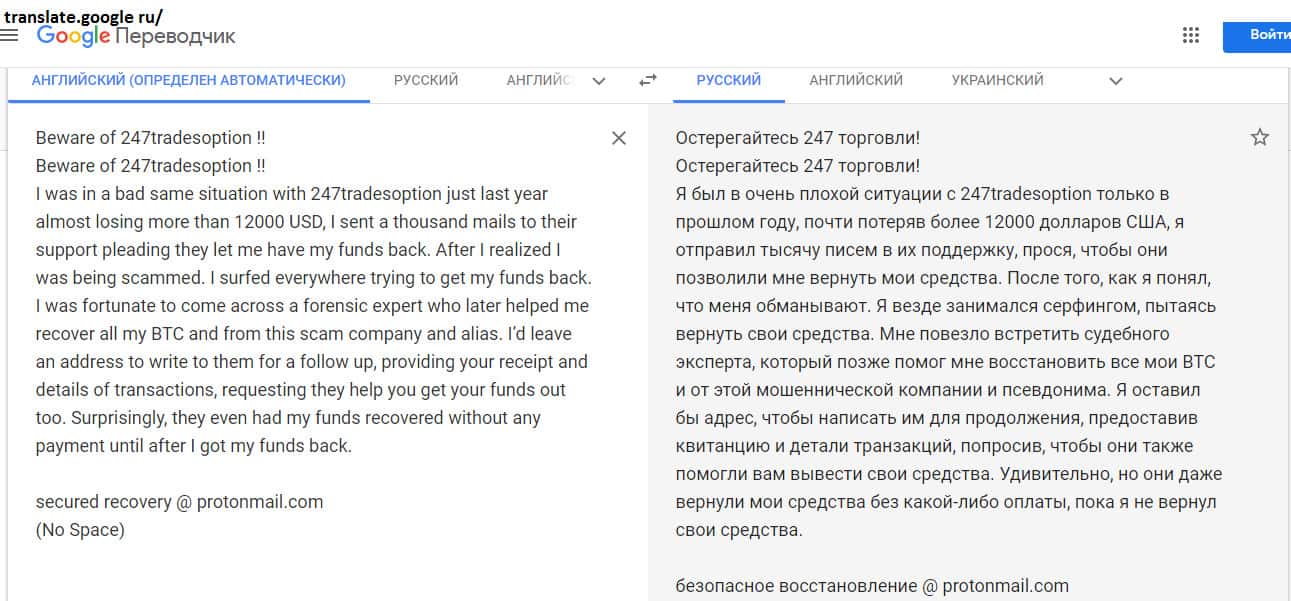 Перевод отзыва о шараге 247TradesOption на translate.google ru
