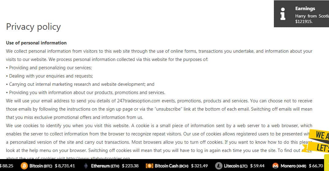 Политика конфиденциальности жуликов 247TradesOption не обеспечивает защиту данных