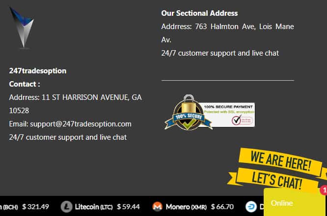 На своем официальном сайте аферисты 247TradesOption предоставили следующую информацию для связи с ними: