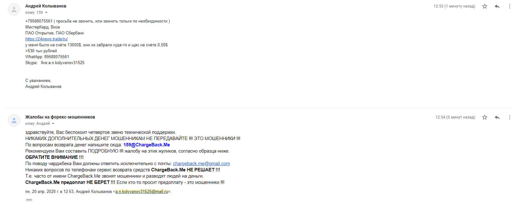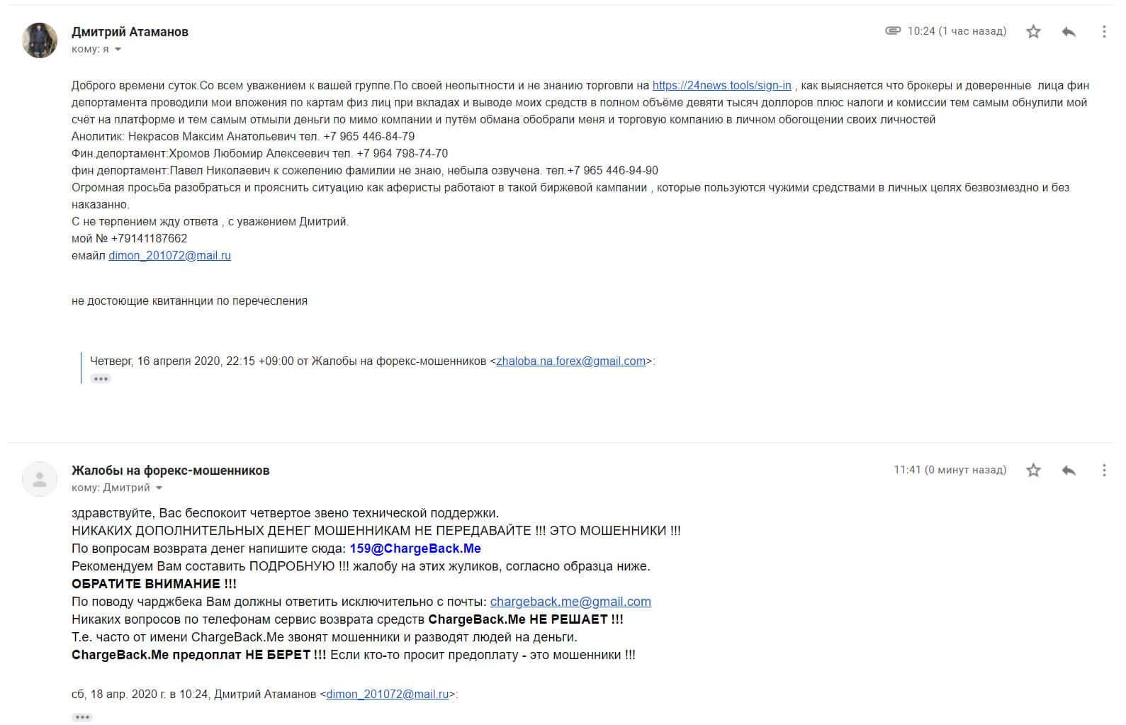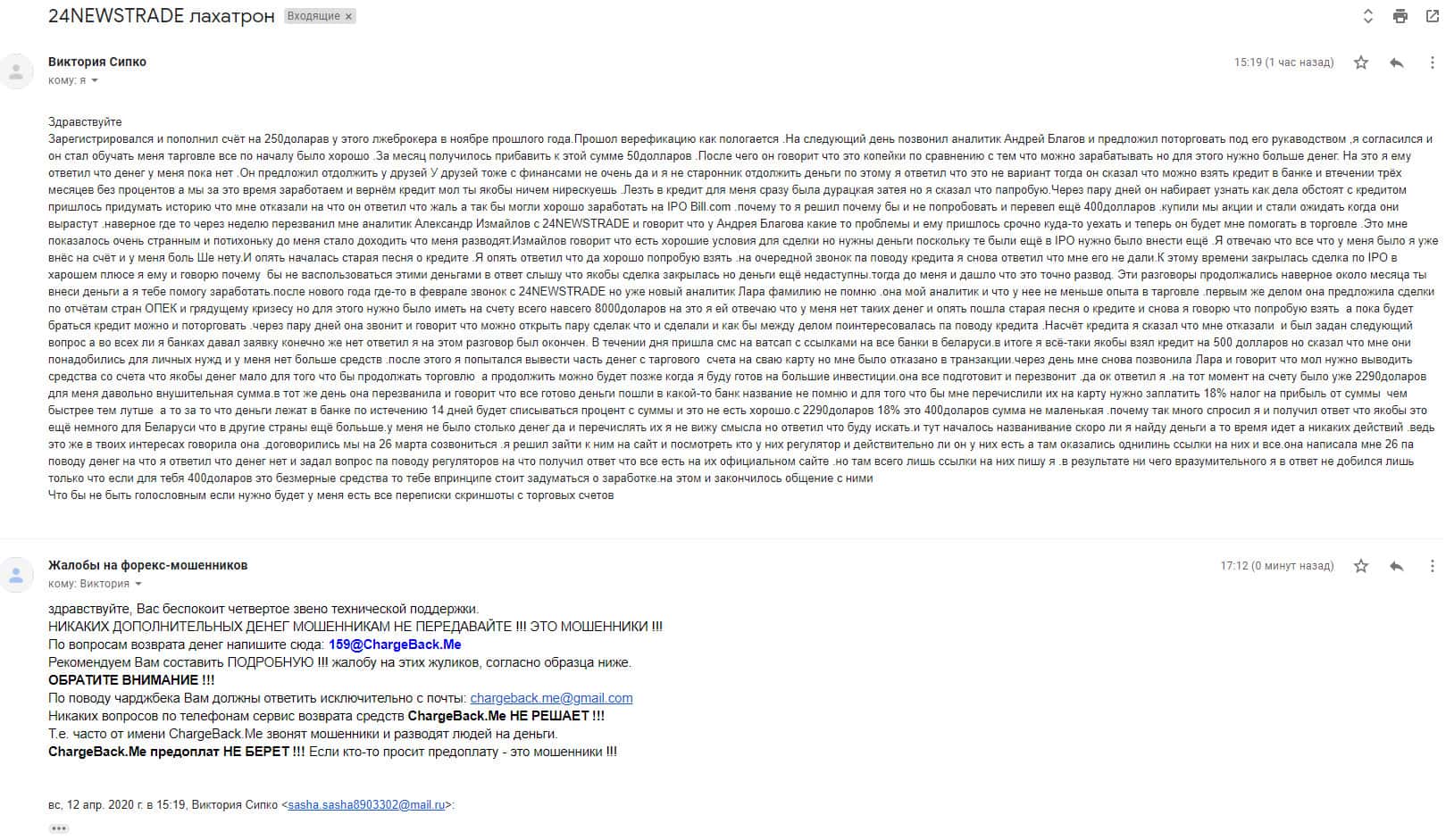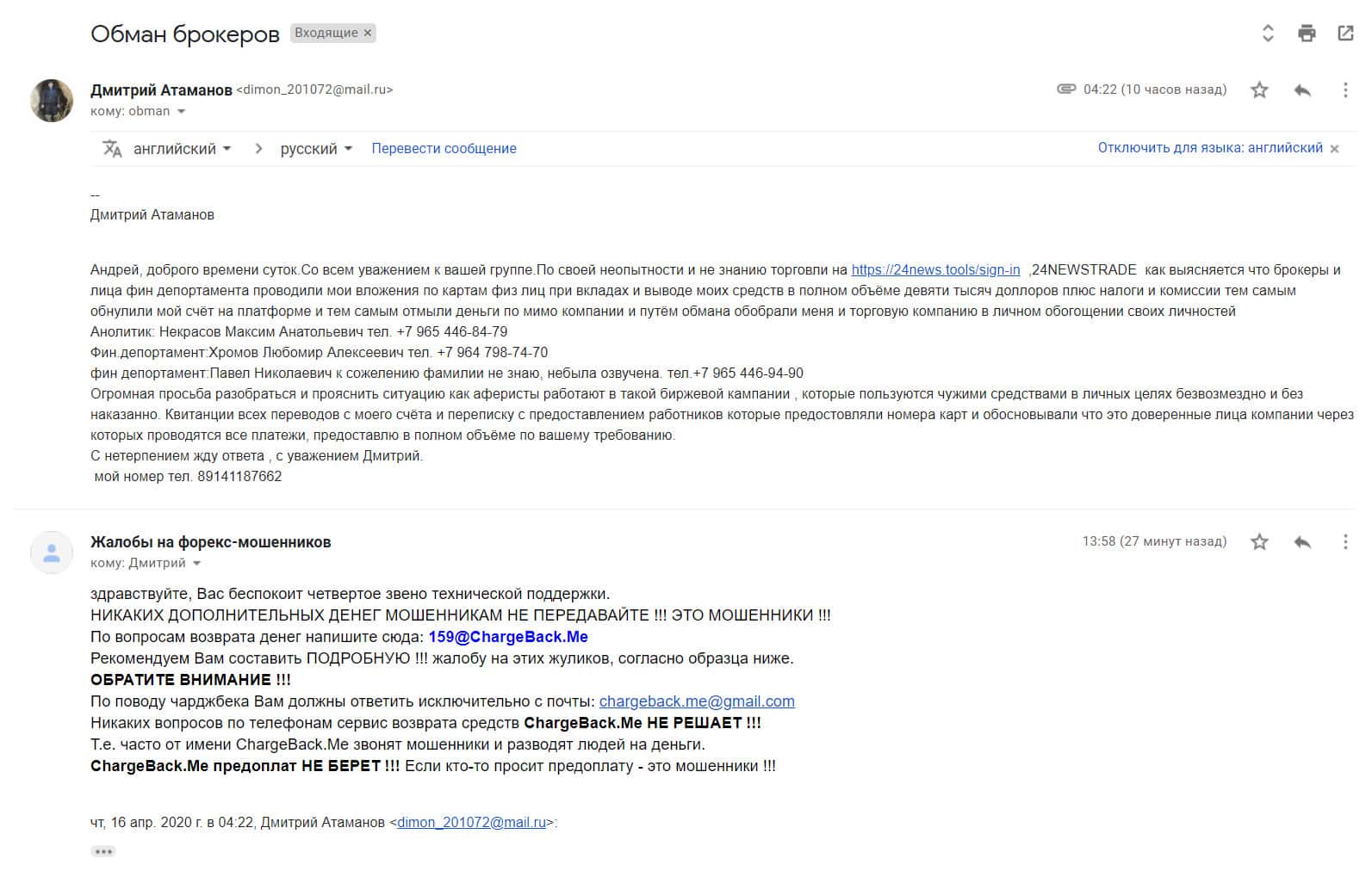 Далее представлена подробная жалоба на мошенническую контору 24 Ньюс Трейд, которая обворовала человека на сумму в размере свыше 5000 долларов. В письме также были указаны имена, фамилии и контакты аферистов, которые занимались кидаловом. Теперь жертва передает эту информацию публичности.