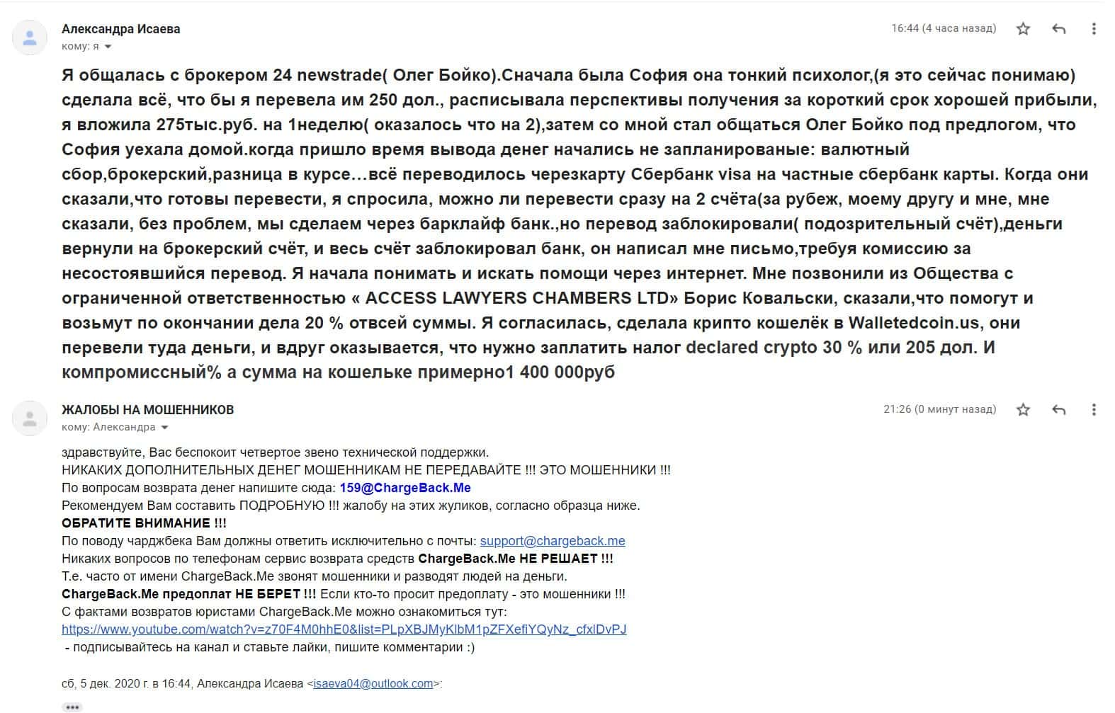Далее представлена еще одна жалоба на брокерскую контору 24 Ньюс Трейд. Девушке написали мошенники в соц-сетях, с предложением приумножить свои деньги. Женщина согласилась, ничего не подозревая. Всё шло хорошо, но когда шулеры показали своё истинное лицо, пострадавшая поняла, что её обманули.