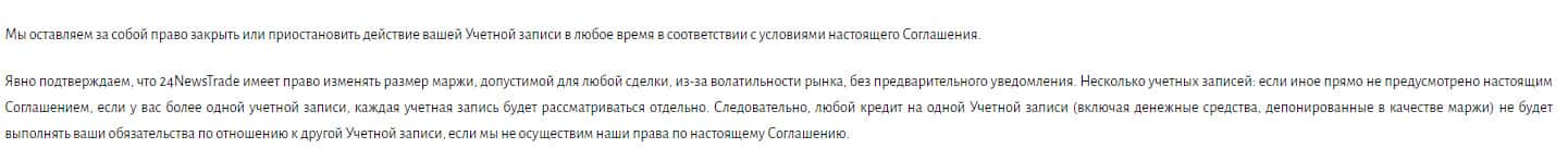 После в условиях у проходимцев 24News Trade следует информация о том, что жулики 24 Ньюс Трейд могут в любой момент по своему личному или же персональному усмотрению удалить учетную запись пользователя или же без предупреждений изменять условия торговли, что автоматически делает мошенников 24News Trade обычной и банальной кухней.
