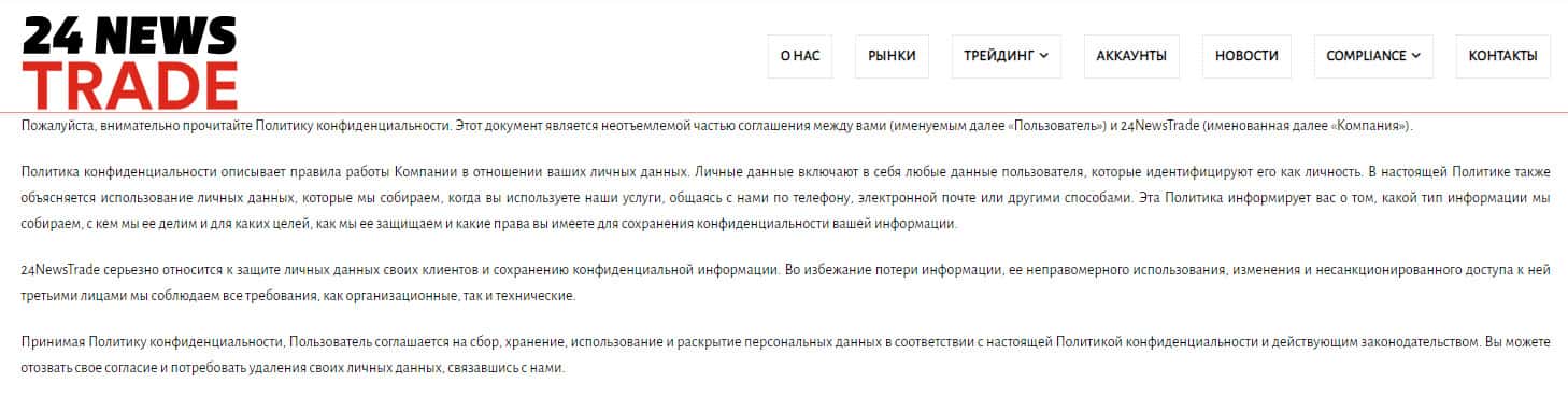 Условия политики конфиденциальности проходимцев 24 Ньюс Трейд