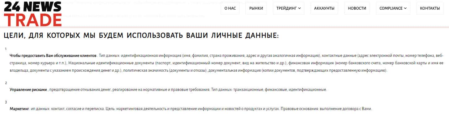 После в политике конфиденциальности у аферистов 24News Trade следует довольно сомнительные цели под предлогом которых шулера 24 Ньюс Трейд будут собирать личную и персональную информацию наивных пользователей. На изображении, расположенном ниже, вы можете наглядно увидеть данный раздел политики конфиденциальности мошенников.