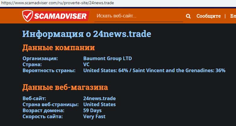 В связи с мошеннической и противозаконной деятельностью лохотрона 24 Ньюс Трейд его реальные руководители предпочитают анонимность дабы избежать ответственности со стороны правоохранительных органов. Техническую же информацию о сайте жулья 24News Trade можно узнать с помощью портала scamadviser com, что вы можете увидеть ниже.