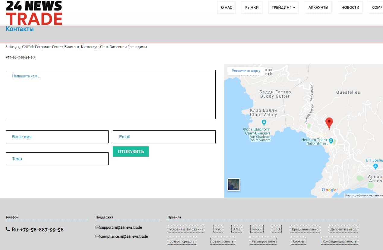 Дополнительным преимуществом для лохотрона 24 Ньюс Трейд является факт их оффшорной регистрации, а именно: Suite 305, Griffith Corporate Center, Бичмонт, Кингстаун, Сент-Винсент и Гренадины, что дает шулерам 24News Trade анонимность их счетов и владельцев. К тому же суды клиентов с жульем будут происходить на территории оффшора.