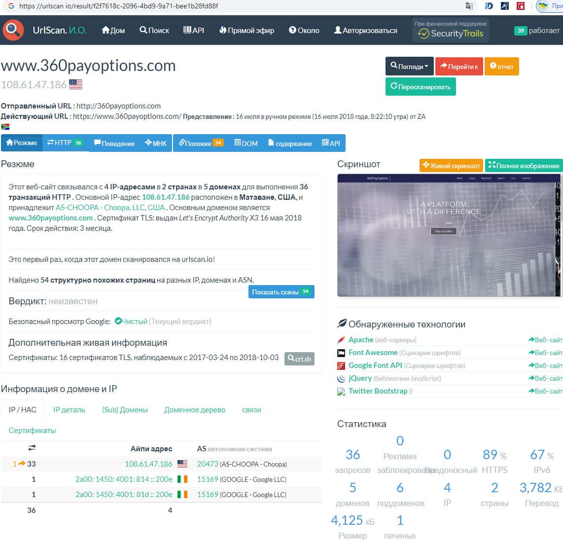 Согласно информации, предоставленной на уважаемом интернет-ресурсе urlscan io, данный веб-сайт шарлатанского форекс дилера 360 Pay Options связывался с 4 IP-адресами в 2 странах в 5 доменах для выполнения 36 транзакций HTTP. Какой-либо точной информации и положительных отзывов о данной шараге нет. В общем тщательно сумели замести следы.