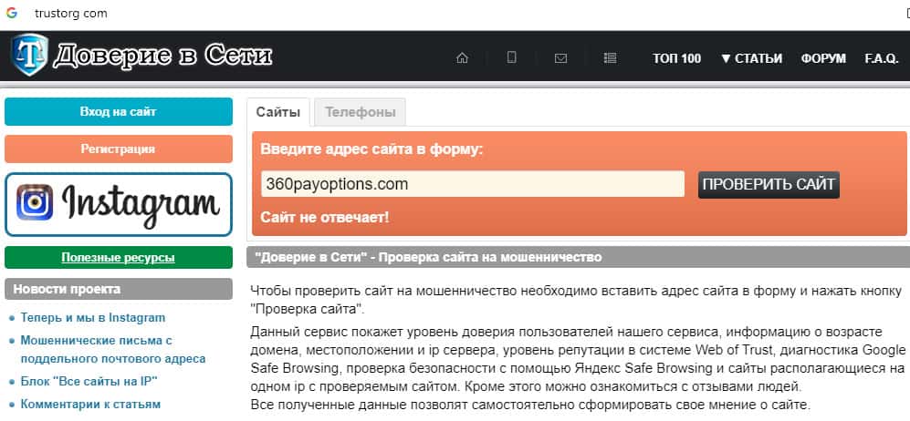 При попытке собрать все сведения о возрасте домена, его происхождении и вообще о самом плутовском форекс дилере 360 Пэй Опционс на известном веб-ресурсе trustorg com, наши усилия оказались тщетными. К сожалению, пока что достать этих злодеев у нас не получится, так как их хакеры хорошенько замели за собой все следы.