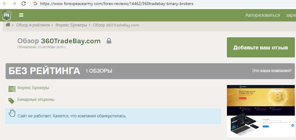 На скриншоте, расположенном ниже, Вы можете ознакомиться с информацией по поводу того, что авторитетный интернет-ресурс предоставляет честный обзор на слившуюся компанию-однодневку 360 Трейд Бай, которая на самом деле обанкротилась. Судя по отзыву руководство по-настоящему соскамило веб-портал и замело за собой все следы.