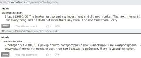 Еще один интернет-пользователь в ужасе от того, сколько негативных отзывов пишут о брокерской кухне 365Trading. Аферисты набили себе такую плохую репутацию, что люди стали бояться даже заходить к ним на сайт. Возможно это и послужило скорейшему схлопыванию конторы. Понятное дело, что с пустыми руками они не ушли, а прикарманили себе как можно больше чужого добра.