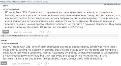 Бинарная контора 365 Трейдинг прошуршала не мало карманов и оставила людей ни с чем. Вот на одном иностранном сайте нам удалось найти отзыв о дилинговой конторе 365Trading - вернее о ее деятельности. Клиенту позвонила одна из сотрудниц конторы, под псевдонимом Бриана Николсон и стала вымогать деньги. Человек повелся на ее предложение и вложил не только свои деньги, а и взял в добавок еще кредитные. После того, как торговля прошла более-менее успешно, жертва лохотрона поставил на вывод часть денег, но спустя несколько месяцев никто не только не обработал заявку, а даже не ответили на звонки. Так деньги и остались лежать на счетах жудиков 365 Трейдинг.