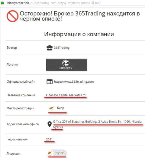 Информацию о соскамившейся конторе 365 Трейдинг мы нашли на одном из интернет-ресурсов под названием binarybroker biz. Для начала рассмотрим некоторые детали самой конторы. Контора была зарегистрирована в 2011 году под другим названием - Fidelisco Capital Markets Ltd, которая имеет прописку на Кипре. Как нам известно, Кипр - это оффшорная зона, где обычно и находятся форекс-мошенники. А вот соответственно и адрес главного офиса конторы 365 Трейдинг: Office 201 of Stassinos Building, 2 Ayias Elenis Str. 1060, Nicosia, Cyprus. Также у себя на сайте аферисты писали, что имеют лицензию CySEC, подтверждения которой так и не было.