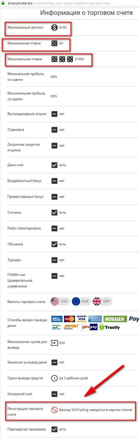 А теперь немного информации о торговом счете, который предоставляла бинарный ДЦ 365 Трейдинг. Депозит начинался от 100 долларов, минимальная и максимальная ставка варьировалась от 5 до 1000 долларов. Это все больше похоже на условие в онлайн-казино, чем брокерской организации. Также стоит выделить, что кухня 365Trading находится в серном списке брокеров, так как вела не честную игру по отношению к своим клиентам.