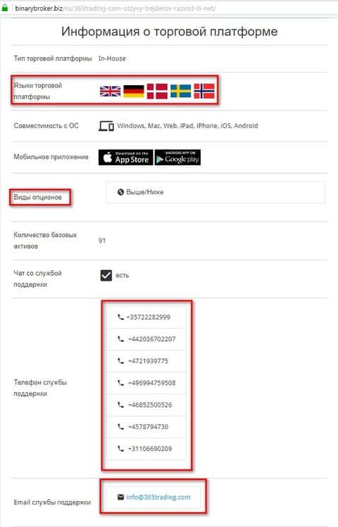 По поводу информации о торговой платформе бинарной кухни 365 Трейдинг, можно сказать, что она была мульти-язычной и предоставляла торговлю бинарными опционами, вернее их кухонным подобием. Также можно выделить номера телефонов и электронную почту, с которых мошенники и вели свою преступную деятельность, разводя наивных клиентов налево и направо: