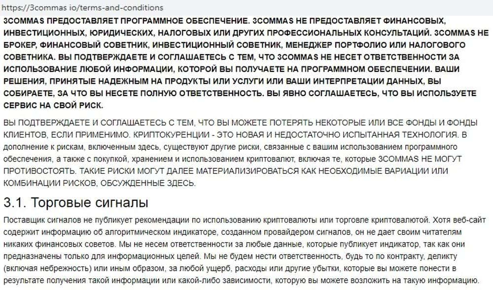 Клиентское соглашение на сайте кидал 3Commas io есть, правда, доступно только на английском языке. Там черным по белому прописано, что контора не предоставляет финансовых услуг, только программное обеспечение, которое может давать сбои. Аналитика носит информационный характер, и за результаты кидалы ответственности не несут.