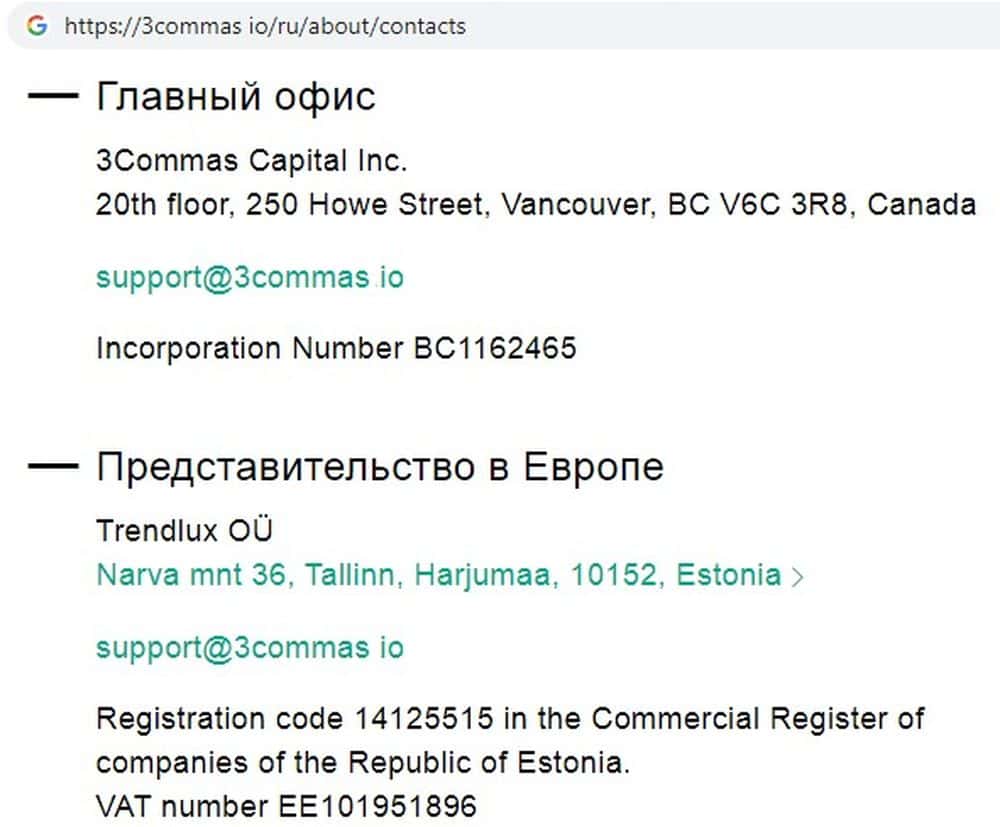 Раздел с контактными данными на сайте кидал 3Коммас есть, но при просмотре что-то вызывало смутные подозрения. Ах да - нет ни одного номера телефона. Несколько адресов электронной почты (в случае недоразумений на ваши письма никто не будет отвечать), онлайн-форма (то же самое), пара адресов и все. Контакты кидал: