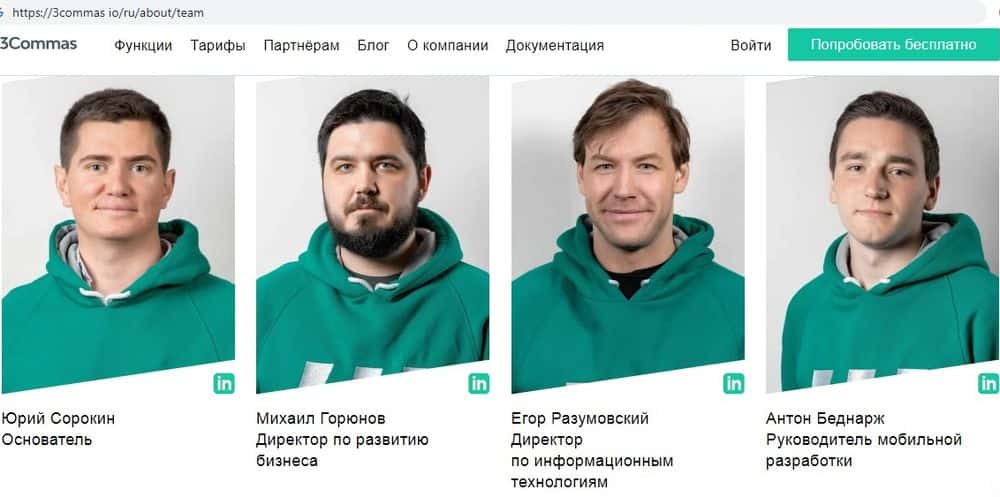 На своем сайте мошенники 3Коммас указывают имена людей, которые якобы являются руководителями проекта, и даже прилагают фотографии. Имеют ли эти люди реальное отношение к управлению скам-конторой нам неизвестно; не ясно, имеют ли они отношение к управляющей конторе Trendlux OÜ. Руководство скам-проекта 3Commas io: