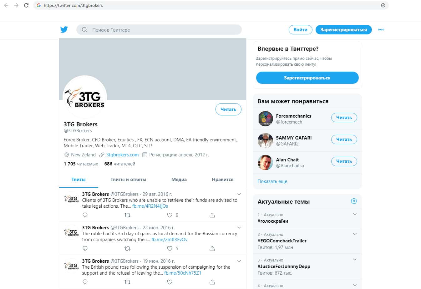 Так же сохранилась страница в твитере, которая принадлежит кидалам 3 ТГ Брокер. Там осталось 686 подписчиков, которые скорее всего накрученные, так как никакие люди не будут следить за компанией, которой не существует. Жулики похоже просто забыли удалить страницу и оставили всё как есть.