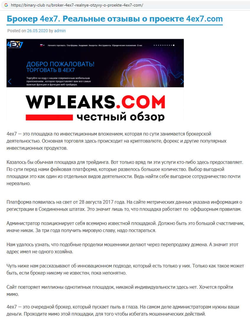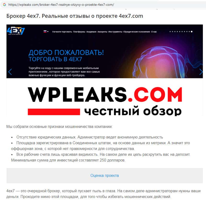 На интернет-сервисе wpleaks com замечена статья-отзыв о жуликах 4EX7. Обнаружен тот факт, что на сайте мошеннической конторы отсутствуют юридические данные, администратор сайта ведет анонимную деятельность. Доверять такой сомнительной компании конечно же нельзя, поскольку велик риск потерять все свои вложенные денежные средства.