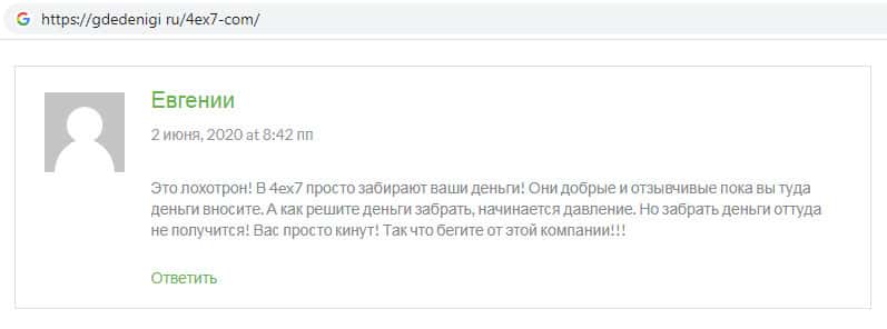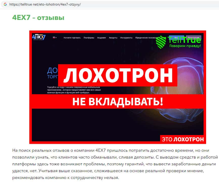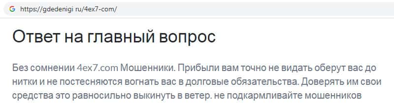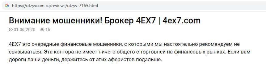 На веб-сайте найден gdedenigi ru единственный пользовательский отзыв о шулерах 4EX7, который является подтверждением того, что перед нами очередной лохотрон. Регистрироваться на их фейковом сайте не рекомендуем по той причине, что судя по всему аферисты подчищают информацию о своей компании, удаляя настоящие отзывы пострадавших.