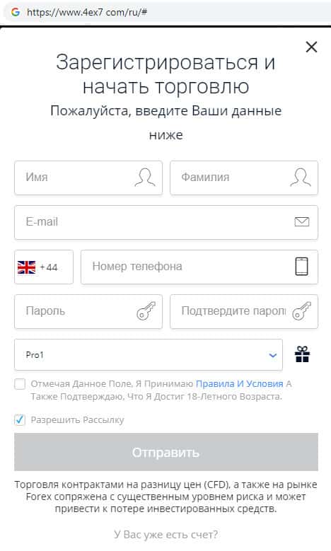 На сайте аферистов 4ИИкс7 не стоит регистрироваться по той причине, что обещания по поводу извлечения выгоды от выбора учетной записи не оправдываются. Все, что пишут здесь мошенники 4EX7 - вранье, и не имеет никакого отношения к реальной деятельности данной псевдо-брокерской организации !!!